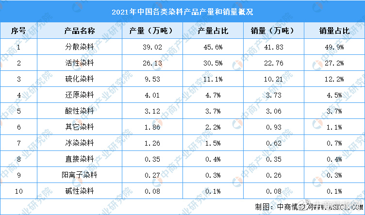 我國可生產的染料品種超過1200個,每年生產的品種有700多個,品種超過100個的有分散染料、活性染料和酸性染料。其中,分散染料產量占比45.57%,活性染料占比30.51%,分散染料的占比最大。2021年,各類染料產品產量和銷量概況如下: