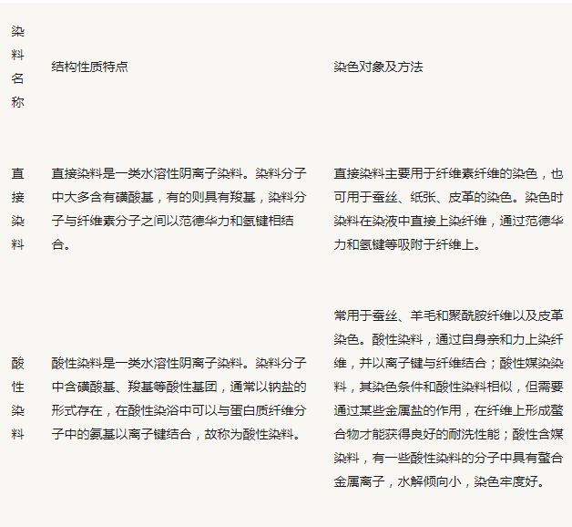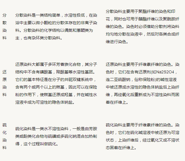 分為:偶氮染料、蒽醌染料、芳甲烷染料、靛族染料、硫化染料、酞菁染料、硝基和亞硝基染料,此外還有其他結構類型的染料,如甲川和多甲川類染料、二苯乙烯類染料以及各種雜環類染料等。