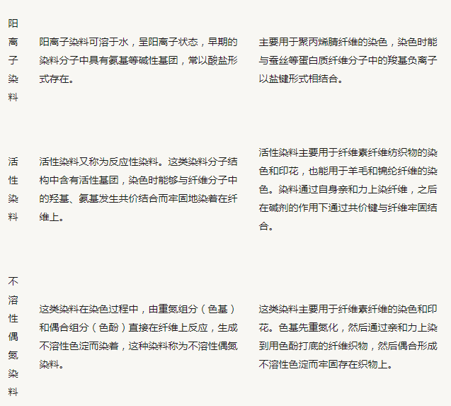 分為:直接染料、酸性染料、陽離子染料、活性染料、不溶性偶氮染料、分散染料、還原染料、硫化染料、縮聚染料、熒光增白劑,此外,還有用於紡織品的氧化染料(如苯胺黑)、溶劑染料、丙綸染料以及用於食品的食用色素等。